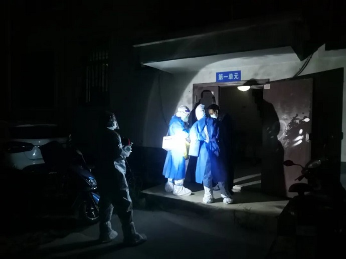 在做好防護(hù)準(zhǔn)備后,扯起嗓門開始耐心的給即將入睡的百姓做起動員。在疫情期間,經(jīng)歷了漫長的等待,蝸居在家的市民大多習(xí)慣了早晚無序的核酸檢測,但還有不少以身體不適、經(jīng)不起“磨煉”等理由進(jìn)行躲避、抗拒,隊(duì)員們不厭其煩,只能冒著風(fēng)險逐戶登門做思想工作。舉燈踱步、排門逐戶做完檢測一眨眼三個多小時過去了,再做好試管封裝,數(shù)據(jù)統(tǒng)計(jì)、校對后已至子夜后半段,深秋微涼的晚風(fēng)已被隊(duì)員的熱情牢牢抵御在防護(hù)服之外。
