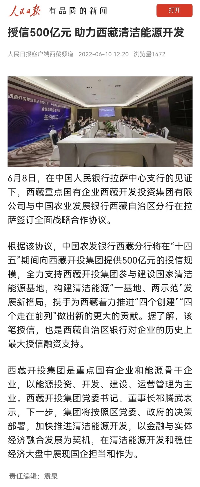 (編者按)6月10日,《人民日報》客戶端西藏頻道報道了《授信500億元 助力西藏清潔能源開發(fā)》?!段鞑厝請蟆?022年6月10日在第2版“高原要聞”欄目刊登文章,報道《授信500億元|西藏開投集團(tuán)與中國農(nóng)發(fā)行西藏分行簽訂全面戰(zhàn)略合作協(xié)議》。西藏電視臺2022年6月10日在西藏電視臺影視文化頻道《今晚九點》欄目報道了《授信500億元|西藏開投集團(tuán)與中國農(nóng)發(fā)行西藏分行簽訂全面戰(zhàn)略合作協(xié)議》,《珠峰云》平臺同步播放。新華網(wǎng)、經(jīng)濟(jì)日報、西藏衛(wèi)視、西藏日報客戶端、網(wǎng)信西藏、今日頭條等媒體均報道了相關(guān)新聞。全文如下: