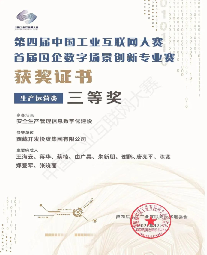 近日,西藏開發(fā)投資集團有限公司在國務(wù)院國資委首屆國企數(shù)字場景創(chuàng)新專業(yè)賽中榮獲生產(chǎn)運營類三等獎。