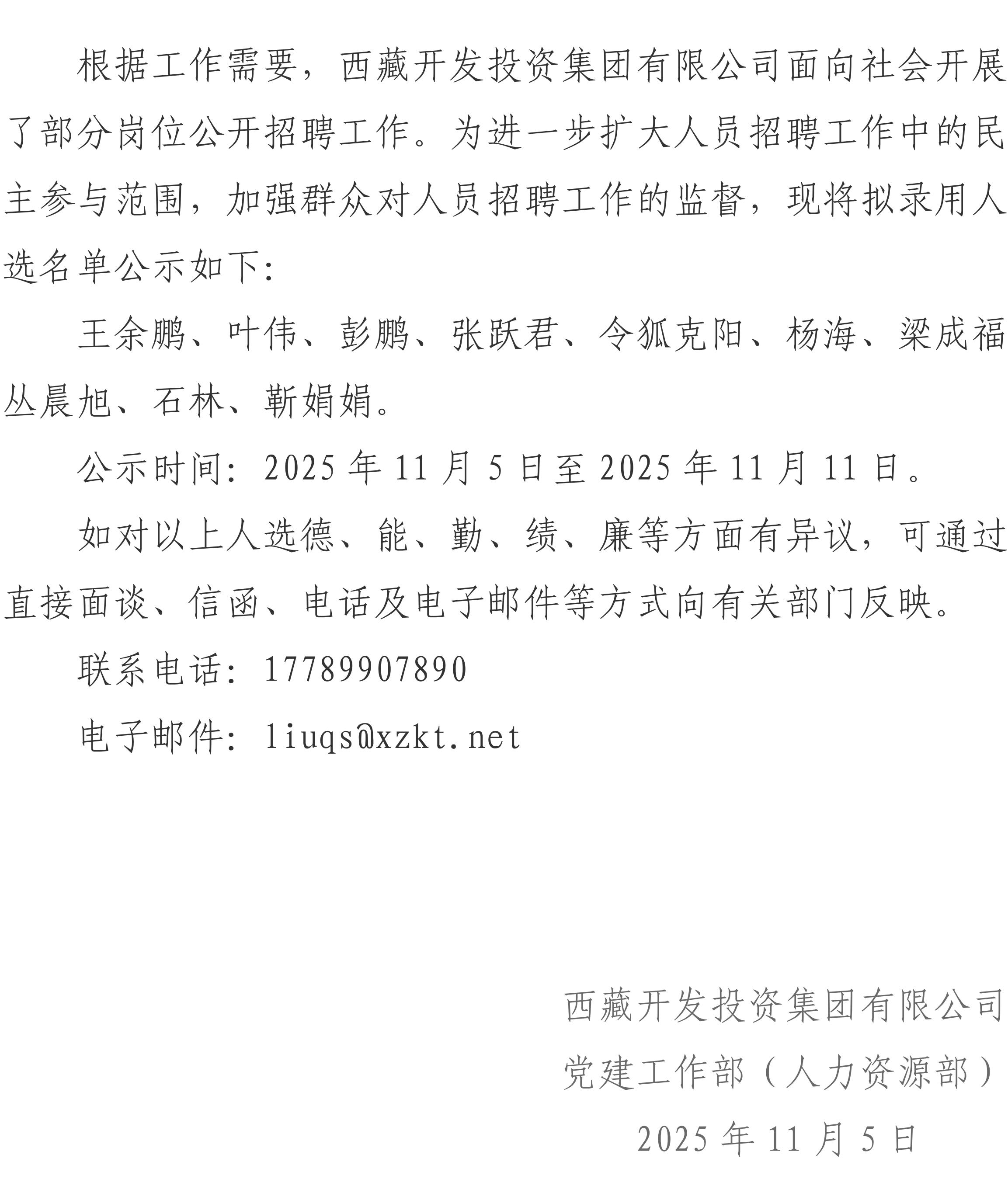西藏開發(fā)投資集團有限公司2025年滾動招聘擬錄用人員公示