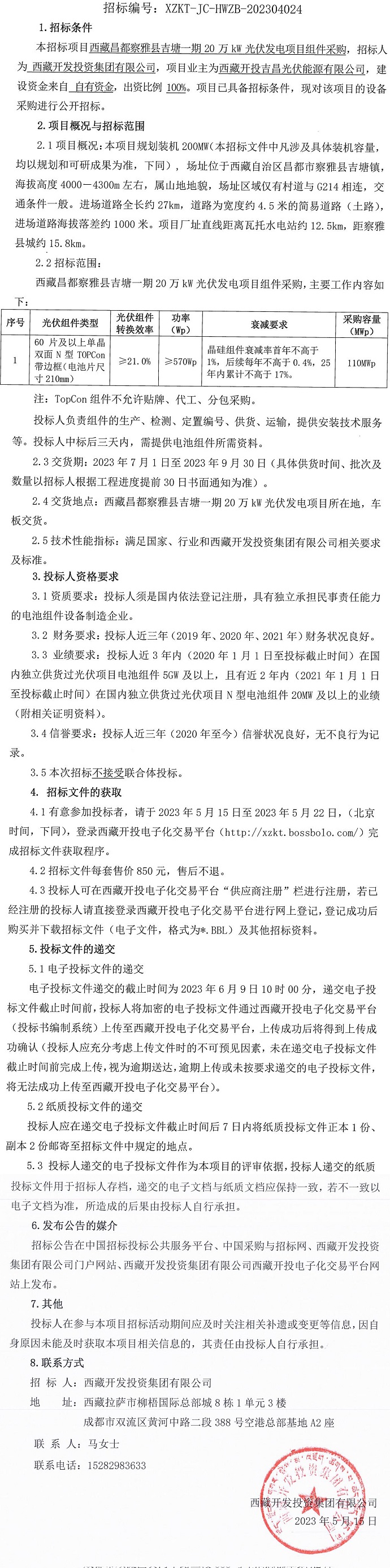 西藏昌都察雅縣吉塘一期20萬kW光伏發(fā)電項(xiàng)目組件采購招標(biāo)公告